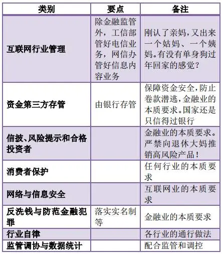 其實很多都是老生常談的要求。比如第2、3、4、6點是金融業的本質要求,不用解釋。第1、5點是互聯網行業的本質要求。第7點是行業自律,各行業的通行做法。第8點強調監管協調,另外統計數據也是為了監管和調控。