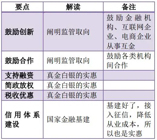 具體有6條。前2條是闡明監管取向(是鼓勵支持),第3-5條是真金白銀的實惠,第6條是一個國家金融體系的基礎設施建設,基礎設施完善了,會降低大家的業務成本、信用成本,所以最終也是實惠。