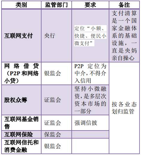 4、分了類以后,這幾個野孩子一人領一個回家管去,這些熊孩子出了事找你們的媽去。勢力范圍大致的劃分是:央媽管支付;銀監會管P2P和原來沾親的互聯網信托和消費金融;證監會管股權眾籌和基金銷售;保監會管互聯網保險。