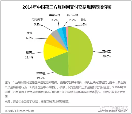 而在監管能力跟得上前,不得已的做法可能是放緩行業腳步(孩兒啊,你慢點跑,等當媽的跟上。比如2014年央行暫停掃碼支付事件)。 (2)行業準入門檻提升,但現有行業格局變化不大,龍頭強者恒強。納入監管后,就有了門檻和牌照。達不到門檻的參與者被取締,市場從原來的“完全競爭市場”向“卡特爾組織”靠近。但剩余企業構成的卡特爾內部,格局變化不大。比如,根據艾瑞的統計,2014年互聯網支付行業中,支付寶占據半壁江山,財付通、銀聯商務、快錢等也占據較大市場份額,其他的參與者份額極小。這一局面,不管是監管前還是監管后,變化不大,預計未來也不會有大的變化。